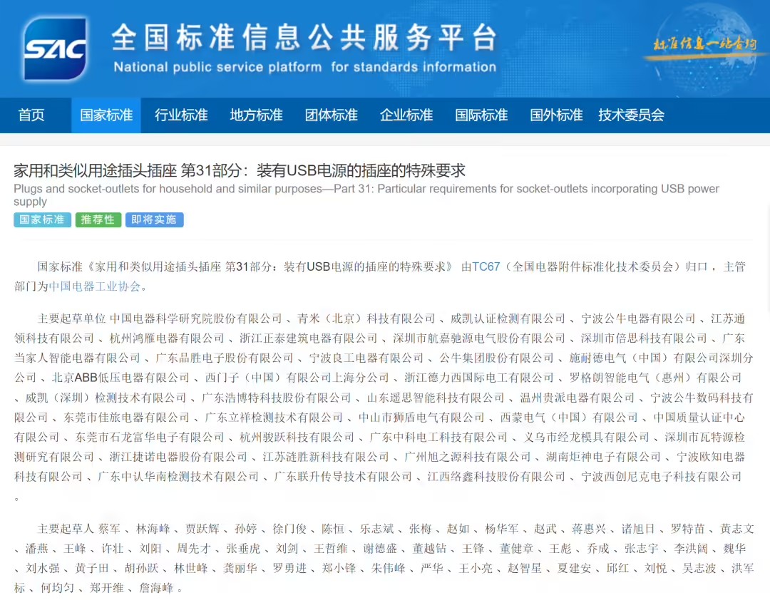 IT之家 5 月 18 日消息,國家市場監(jiān)督管理總局(國家標(biāo)準(zhǔn)化管理委員會)4 月 25 日批準(zhǔn)《家用和類似用途插頭插座 第 31 部分:裝有 USB 電源的插座的特殊要求》等 295 項(xiàng)推薦性國家標(biāo)準(zhǔn)和 2 項(xiàng)推薦性國家標(biāo)準(zhǔn)修改單。其中,USB 電源插座新規(guī)將在 2025 年 11 月 1 日實(shí)施。