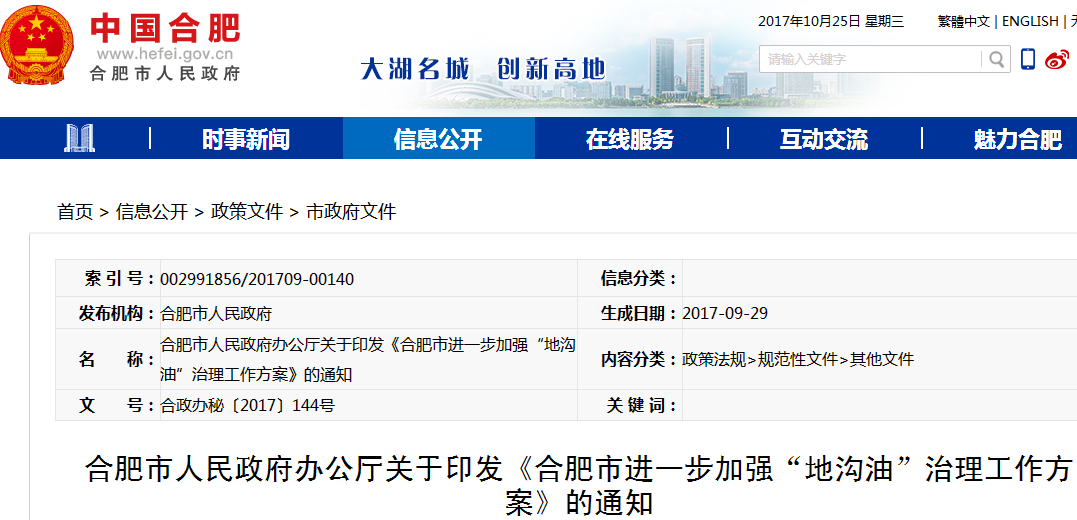 日前,合肥市印發(fā)了《合肥市進一步加強“”治理工作方案》,方案提出將的處置情況與餐飲服務單位的等級評定掛鉤,按照餐廚廢棄物資源化利用和無害化處理國家試點的要求,積極推進在行政企事業(yè)單位食堂和大中型餐飲企業(yè)全面安裝油水隔離池、油水分離器等設施,并在總結經驗的基礎上出臺措施加快向商業(yè)綜合體、餐飲美食街、攤...