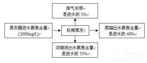 進(jìn)入蒸發(fā)器后的氨氮通過三個(gè)途徑排出蒸發(fā)器:蒸餾出水、濃縮液出水、排氣夾帶。由于氨在水中的溶解度極大,所以排氣中夾帶氨量很少,蒸發(fā)之后的氨氮主要存在于濃縮液和蒸發(fā)出水中。因此蒸發(fā)工藝出水氨氮含量高,一般不能達(dá)到排放標(biāo)準(zhǔn)的要求,需增加后續(xù)去除氨氮的設(shè)施。以進(jìn)水氨氮2000mg/L計(jì)算為例,其平衡圖見圖1。由于蒸發(fā)之后的氨氮含量仍遠(yuǎn)遠(yuǎn)高于排放標(biāo)準(zhǔn)的要求,因此蒸發(fā)后必須進(jìn)行脫氮處理。目前國內(nèi)常用的方法是采用離子交換法去除氨氮。
