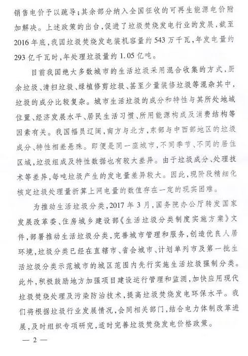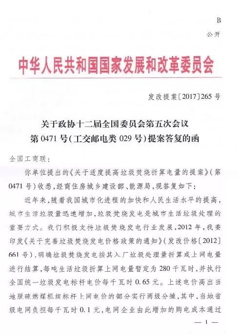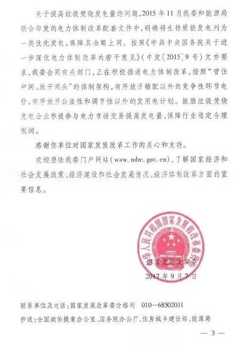 今年年初,環(huán)境商會以全國工商聯(lián)團(tuán)體提案的形式向兩會遞交《關(guān)于適度提高垃圾焚燒折算電量的提案》,國家發(fā)改委于9月正式答復(fù)。