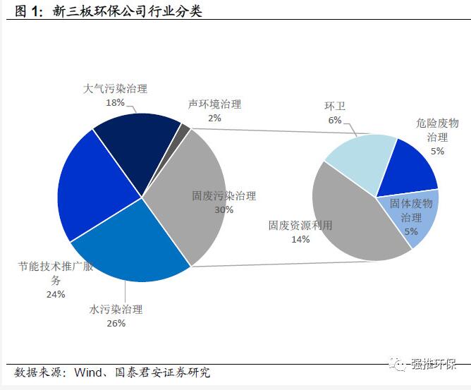 102家新三板掛牌環(huán)保公司中,從事固廢、水、節(jié)能、大氣治理業(yè)務(wù)數(shù)量比例分別為30%、26%、24%、18%。在萬(wàn)德分類的新三板102家環(huán)保公司中,參考掛牌公司管理型行業(yè)分類及各公司主業(yè),除去6家主業(yè)為其他領(lǐng)域(光伏、工業(yè)二氧化碳制造等)公司后,剩余96家公司中,①?gòu)氖鹿虖U污染治理的公司29家(其中資源回收13家、環(huán)衛(wèi)6家、危廢5家、固廢處置5家);②從事水污染治理的公司25家;③從事節(jié)能服務(wù)的公司23家(工業(yè)及建筑節(jié)能等);④從事大氣污染治理的公司17家;⑤從事聲環(huán)境治理的公司2家。從公司數(shù)量占比來(lái)看,固廢、水、節(jié)能、大氣、聲環(huán)境治理公司數(shù)量占比分別為30%、26%、24%、18%、2%。