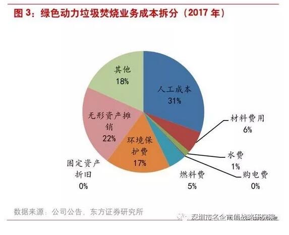 決定垃圾焚燒運(yùn)營(yíng)成本的主要因素包括:項(xiàng)目初始投資(決定折舊及攤銷(xiāo)),負(fù)債率及平均利率(決 定財(cái)務(wù)費(fèi)用),環(huán)保排放標(biāo)準(zhǔn)(決定環(huán)境保護(hù)費(fèi)、材料費(fèi)等),根據(jù)部分公司披露的項(xiàng)目運(yùn)營(yíng)成本 分析,綠色動(dòng)力垃圾焚燒業(yè)務(wù)的主要成本構(gòu)成為:人工成本(31%)、無(wú)形資產(chǎn)攤銷(xiāo)(22%)、環(huán) 境保護(hù)費(fèi)(17%)等。中國(guó)天楹的主要成本構(gòu)成為:折舊及攤銷(xiāo)(37%)、原材料(24%)、人工(20%)。無(wú)形資產(chǎn)攤銷(xiāo)主要來(lái)自于垃圾焚燒項(xiàng)目投資,一般采取直線法進(jìn)行攤銷(xiāo)。其他運(yùn)營(yíng)成本 包括檢修支出及檢測(cè)費(fèi)用等。