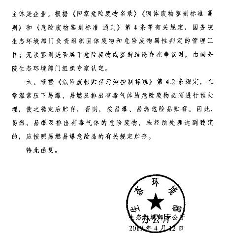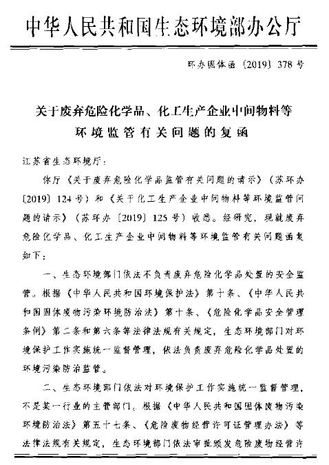 日前,生態(tài)環(huán)境部辦公廳公布關(guān)于廢棄危險(xiǎn)化學(xué)品、化工生產(chǎn)企業(yè)中間物料等環(huán)境監(jiān)管有關(guān)問題的復(fù)函。其中指出: