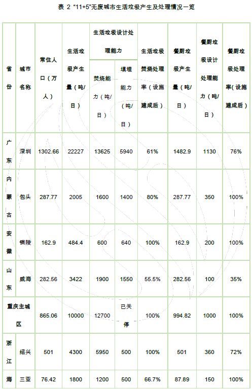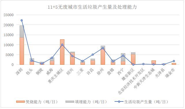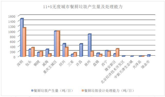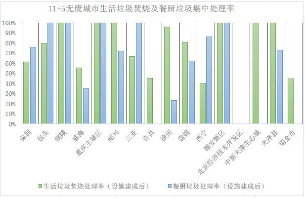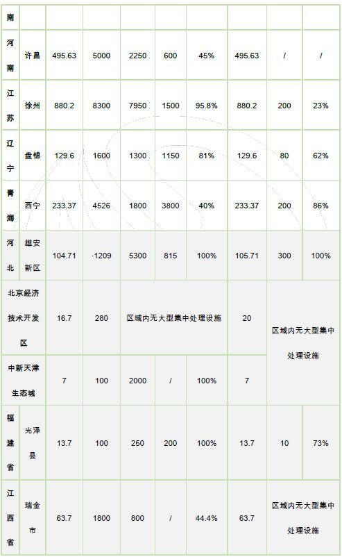 入選城市中固廢管理水平和信息公開程度差異明顯,11個(gè)試點(diǎn)城市以百萬人口級為主,是我國大多數(shù)地級市的典型代表。目前大多已有或在建有生活垃圾焚燒設(shè)施和餐廚垃圾集中處理設(shè)施。5個(gè)特例地區(qū)由于實(shí)際情況不同差異較大:雄安新區(qū)規(guī)劃處理能力、技術(shù)路線明顯較優(yōu),北京、天津兩開發(fā)區(qū)由于區(qū)域內(nèi)人口及面積所限,大多采用域協(xié)同、小型分散處理的方式,但無害化水平均相對較高,地方縣、縣級市垃圾集中處置水平有待提升。