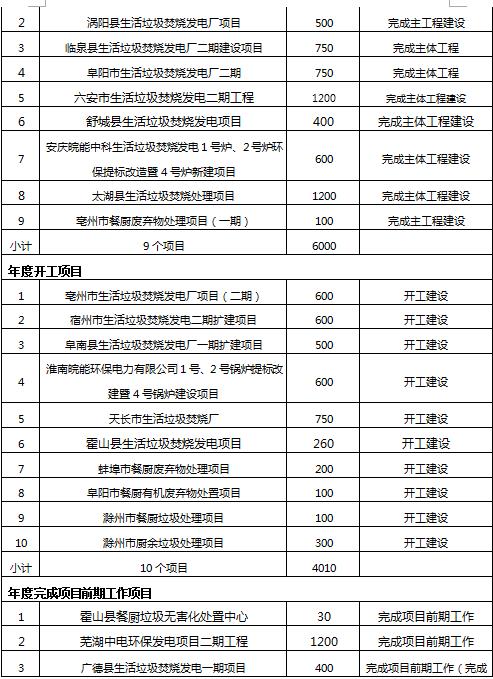 (三)年內完成開工建設項目。開工建設天長市、霍山縣垃圾焚燒發(fā)電項目,亳州市、宿州市垃圾焚燒發(fā)電二期項目,阜南縣垃圾焚燒發(fā)電一期擴建項目,淮南垃圾焚燒發(fā)電提標改造暨新建項目,以及蚌埠市、阜陽市、滁州市餐廚和廚余垃圾處理項目等10個項目。