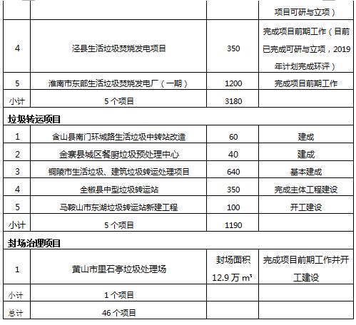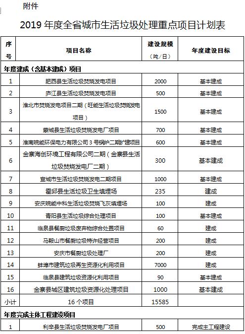 (一)年內必須建成(含基本建成)的項目。建成霍邱縣生活垃圾衛(wèi)生填埋場項目,臨泉縣、馬鞍山市、安慶市餐廚垃圾處理廠項目,蚌埠市建筑垃圾再生資源化利用項目,安慶皖能中科生活垃圾焚燒飛灰填埋場項目等6個項目;基本建成肥西縣、廬江縣、蒙城縣生活垃圾焚燒發(fā)電項目,淮北市、金寨縣、宣城市、淮南市焚燒發(fā)電項目二期,青陽縣生活垃圾綜合處理項目,臨泉縣、金寨縣建筑垃圾資源化利用處理項目等10個項目。