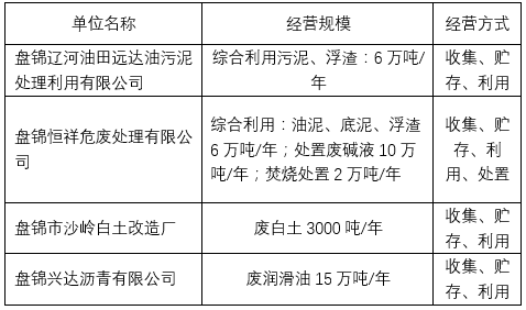 截止2017年,盤錦市擁有危險(xiǎn)廢棄物經(jīng)營(yíng)資質(zhì)的單位4家,如下表所示。