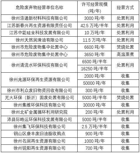 徐州市危險(xiǎn)廢棄物經(jīng)營(yíng)單位情況見下表。