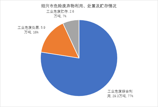二、危險(xiǎn)廢棄物:同年度,紹興市全市工業(yè)危險(xiǎn)廢棄物產(chǎn)生量為31.9萬(wàn)噸,利用、貯存和處置情況具體見下圖。
