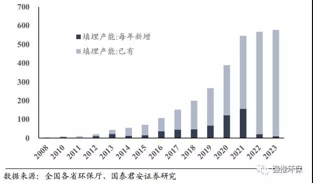 預計2021年,全國填埋處置產能約為512萬噸/年。到2023年底,填埋產能規(guī)模將不低于574萬噸,較之2018年底的200萬噸/年,產能擴張彈性為188%。