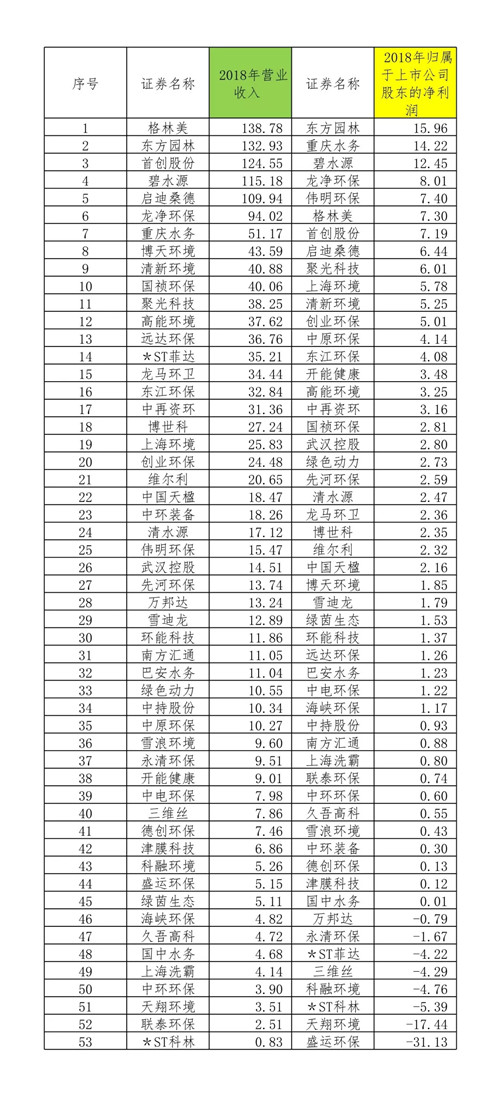 表1 53家環(huán)保上市公司2018年營業(yè)收入、凈利潤匯總表(數(shù)據(jù)來源于各公司年報)