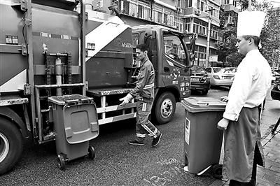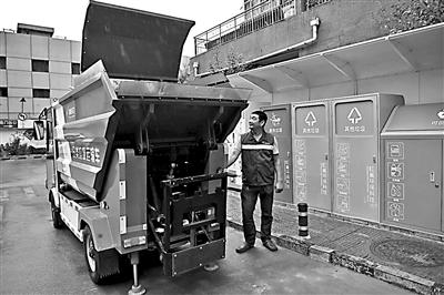 朝陽區(qū)白領(lǐng)家園小區(qū)的垃圾由不同的垃圾運輸車分類運輸攝影/本報記者 黑建軍