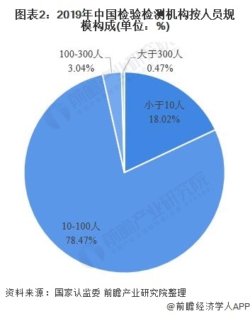 雖然我國檢驗檢測產(chǎn)業(yè)規(guī)模不斷擴(kuò)大、產(chǎn)業(yè)結(jié)構(gòu)持續(xù)優(yōu)化、科研創(chuàng)新能力不斷增強(qiáng),但“小、散、弱”的基本面貌仍未改變。目前,我國檢驗檢測機(jī)構(gòu)主要以規(guī)模在10-100人的為主,2019年,全國10-100人的檢驗檢測機(jī)構(gòu)占78.47%,而100-300人的檢驗檢測機(jī)構(gòu)僅占3.04%;300人以上的更是不足1%。