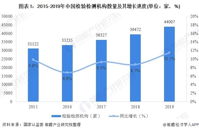 據(jù)國家認(rèn)監(jiān)委統(tǒng)計數(shù)據(jù)顯示,2015年以來,我國檢驗檢測機(jī)構(gòu)數(shù)量持續(xù)增長,截至到2019年底,全國檢驗檢測機(jī)構(gòu)數(shù)量突破4萬家,達(dá)到44007家,同比增長11.5%。