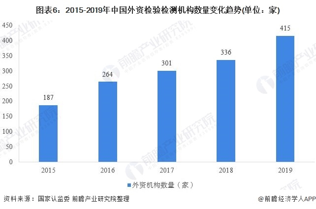 近年來,在國內(nèi)民營企業(yè)快速發(fā)展的同時,外資檢驗檢測機(jī)構(gòu)也迅速進(jìn)入中國市場,2015年,全國外資檢驗檢測機(jī)構(gòu)僅187家,到2019年底,全國外資檢驗檢測機(jī)構(gòu)數(shù)量達(dá)到415家,同比增長23.51%;實現(xiàn)營業(yè)收入238.25億元,同比增長18.71%。