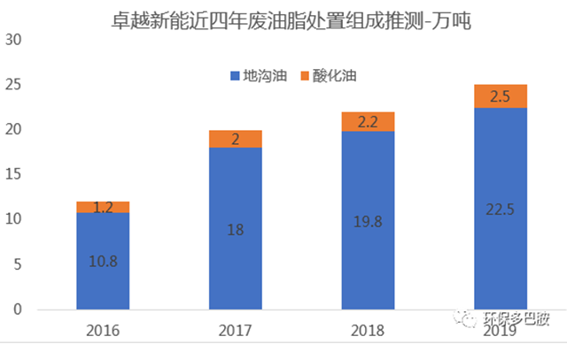 以卓越新能為例,2016-2019期間,公司廢油脂采購量達(dá)到 12萬噸、20萬噸、22 萬噸和25萬噸。按廢油脂總量包括90%地溝油及10%酸化油的比例推測(cè),卓越新能2019年即處置地溝油22.5萬,約616t/d。