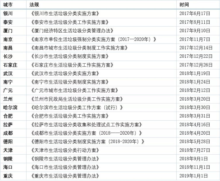 2017年底,住房城鄉(xiāng)建設(shè)部發(fā)布《關(guān)于加快推進部分重點城市生活垃圾分類工作的通知》,要求2018年3月底前,46個重點城市要出臺生活垃圾分類管理實施方案或計劃行動,明確年度工作目標,量化工作任務(wù)。