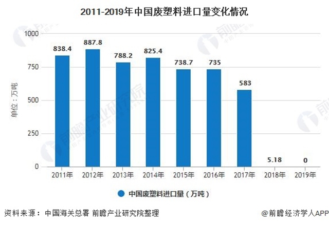 2019年廢塑料進(jìn)口量為零,總體呈增速放緩特征,這主要是由于全球經(jīng)濟(jì)增長放緩和中美貿(mào)易戰(zhàn)影響,導(dǎo)致工業(yè)源廢塑料回收量減少,而生活源廢塑料回收由于各地垃圾分類和我國一次性塑料消費(fèi)增長有所增加。
