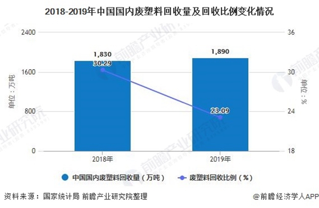 據(jù)測算,回收利用1噸廢塑料相當(dāng)于節(jié)省約6噸石油。中國物資再生協(xié)會再生塑料分會統(tǒng)計(jì)數(shù)據(jù)顯示,2019年中國國內(nèi)廢塑料回收量1890萬噸,較2018年(1830萬噸)增加60萬噸,增幅3.3%,由于2019年我國塑料制品產(chǎn)量較高,我國廢塑料回收比例下降,僅為23.09%。