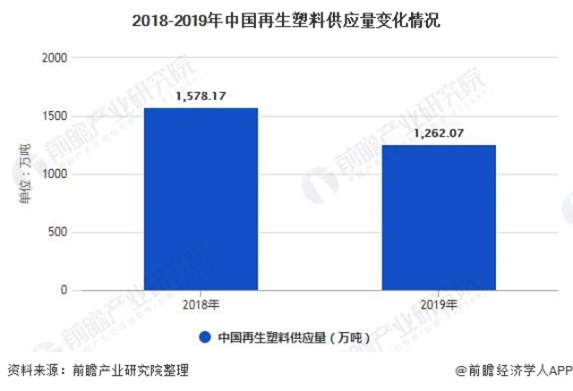 受國家政策影響,自2019年中旬開始,進(jìn)口廢塑料已經(jīng)全面消失。再加上近年來各地環(huán)保整頓的加劇,中國再生塑料市場近年來波動(dòng)較大。2019年中國再生塑料總供應(yīng)量在1262.07萬噸,較2018年減少316.1萬噸。