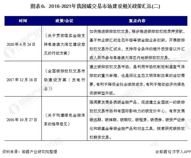 碳排放權交易體系是實現低成本碳減排的關鍵。2016-2021年是我國碳交易市場的黃金時期,我國出臺了一系列政策建立包括建立相關綠色金融、碳中和等來推動碳交易市場發(fā)展,具體政策匯總如下: