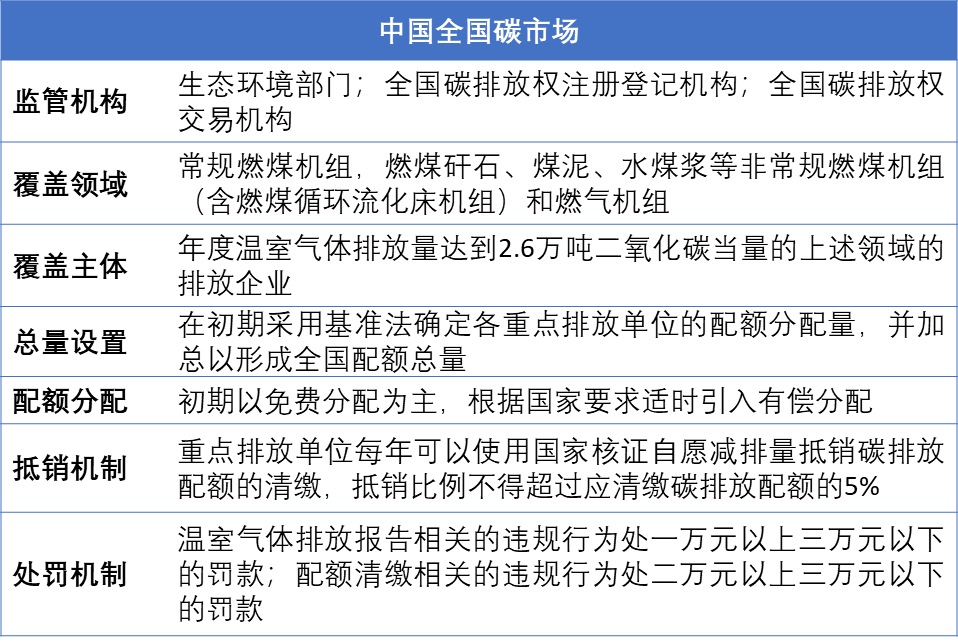 目前,中國的全國碳市場已經(jīng)進入交易前的最后準備階段。參考生態(tài)環(huán)境部發(fā)布的《2019-2020年全國碳排放權交易配額總量設定與分配實施方案(發(fā)電行業(yè))》、《碳排放權交易管理辦法(試行)》以及《碳排放權交易管理暫行條例(草案修改稿)》等文件,即將啟動的全國碳市場將以生態(tài)環(huán)境部門為主要監(jiān)管機構、覆蓋范圍為化石能源發(fā)電及發(fā)熱行業(yè)的二氧化碳排放,在初期通過基準法確定各重點排放單位的配額分配量,并加總以形成全國配額總量。此外,初期的配額分配將以免費分配為主,同時允許以國家核證自愿減排量抵銷碳排放配額,抵消比例不得超過應清繳碳排放配額的5%。相關的機制設計見下表: