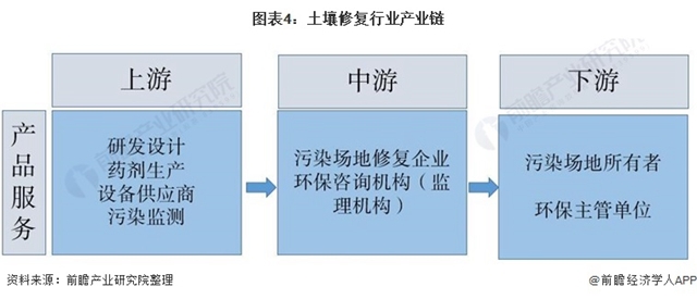 土壤修復行業(yè)上游包括相關藥劑和設備的研發(fā)設計、藥劑生產(chǎn)商、設備供應商及土壤污染監(jiān)測商,為土壤修復提供設備技術支持;行業(yè)下游通常為受污染場地的所有者或環(huán)保主管單位,土壤修復項目由下游企業(yè)提出并為項目出資。行業(yè)中游為一些土壤修復企業(yè)和環(huán)保咨詢機構。中游企業(yè)負責受污染地塊的前期調(diào)查、風險評估,中后期工程實施、竣工驗收以及后期的評估工作。