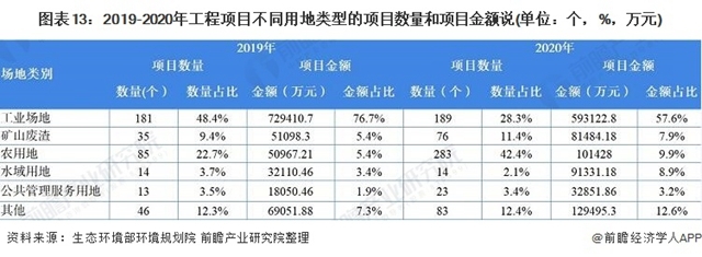 從土壤修復工程項目數(shù)量來看,2020年行業(yè)熱度持續(xù)增加,除水域用地類外,各類型工程類項目數(shù)量均有不同幅度的增加。從項目金額來看,2020年除工業(yè)場地項目總金額略有減少外,其他類型項目總金額均有不同幅度的增加。2020年,工業(yè)場地類土壤修復工程項目仍占據(jù)行業(yè)市場的主要份額,項目金額比重最大達到57.6%。