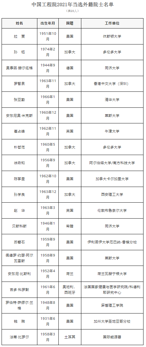 根據(jù)《中國科學院院士章程》《中國科學院院士增選工作實施細則》《中國科學院外籍院士選舉辦法》等規(guī)定,2021年中國科學院選舉產(chǎn)生了65名中國科學院院士和25名中國科學院外籍院士。現(xiàn)予公布。