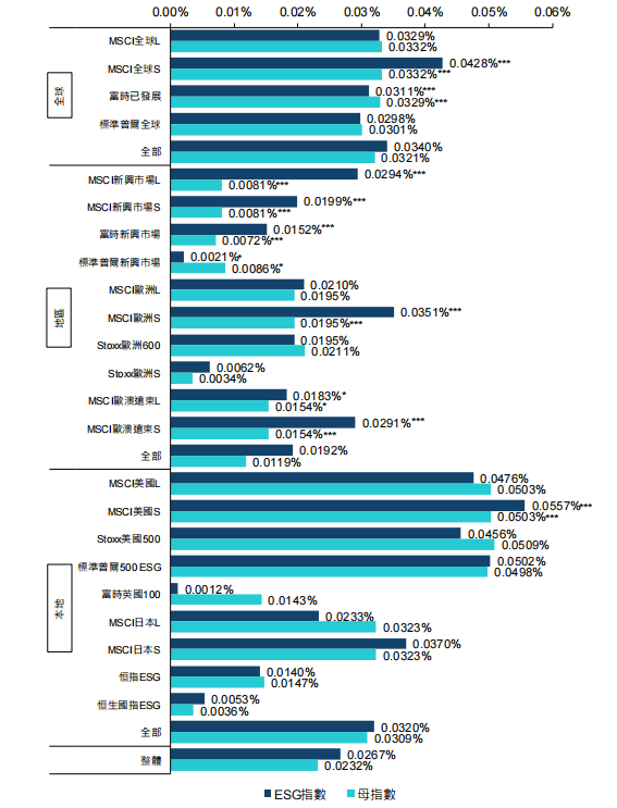 根據(jù)香港交易所于2020年11月發(fā)布的《ESG股票指數(shù)與傳統(tǒng)股票指數(shù)的表現(xiàn)比較》,部分國(guó)際ESG指數(shù)表現(xiàn)呈現(xiàn)出兩個(gè)特點(diǎn):一是大多數(shù)時(shí)候,ESG指數(shù)的投資回報(bào)率和回報(bào)率波幅與母指數(shù)不相伯仲,且在一些情況下,ESG指數(shù)會(huì)更勝一籌。這一定程度上說(shuō)明了ESG投資在追求道德投資的同時(shí),通常并不會(huì)犧牲財(cái)務(wù)回報(bào)。如圖3所示,該報(bào)告2010年7月至2020年6月這一期間的各代表性ESG主題指數(shù)與對(duì)應(yīng)的母指數(shù)的回報(bào)表現(xiàn)作比較,并對(duì)每日回報(bào)率的差異進(jìn)行了t-檢驗(yàn)及F-檢驗(yàn)以探究該差異在統(tǒng)計(jì)學(xué)上是否具有顯著性。結(jié)果顯示,在所研究的23對(duì)指數(shù)中,有13對(duì)的ESG主題指數(shù)的平均每日回報(bào)率高于其母指數(shù),當(dāng)中8對(duì)(全球市場(chǎng)指數(shù)1對(duì)、地區(qū)市場(chǎng)指數(shù)6對(duì)、本地市場(chǎng)指數(shù)1對(duì))在統(tǒng)計(jì)學(xué)上有顯著差異。這一定程度上說(shuō)明了,即使許多時(shí)候ESG主題指數(shù)的風(fēng)險(xiǎn)回報(bào)表現(xiàn)就算不是比其母指數(shù)更勝一籌,也不相伯仲,即有較高回報(bào)及/或較低風(fēng)險(xiǎn)(每日回報(bào)率的標(biāo)準(zhǔn)差)。