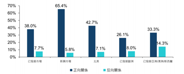 圖4.實(shí)證研究中發(fā)現(xiàn) ESG 表現(xiàn)與公司財(cái)務(wù)表現(xiàn)之間有正或反向關(guān)系的數(shù)量所占比例