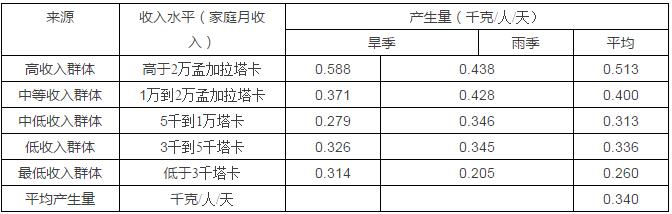 達卡市不同收入水平人群的廢物產(chǎn)生狀況(1人民幣約合13塔卡)