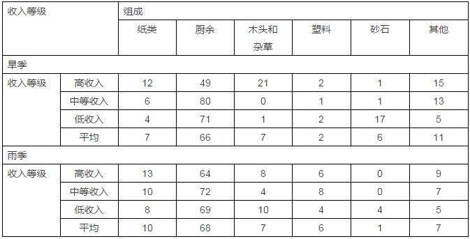 在達卡市,廢物的產(chǎn)生按重量計算,存在旱季和雨季的差別:在雨季,包括有機廢物在內(nèi)的各類能夠降解的廢物含有更多的水分,所以重量與旱季時相比會更大。此外,不同收入水平的人群廢物的產(chǎn)生量也存在極大的差異:收入最高人群的人均廢物產(chǎn)生量幾乎是收入最低人群的兩倍。