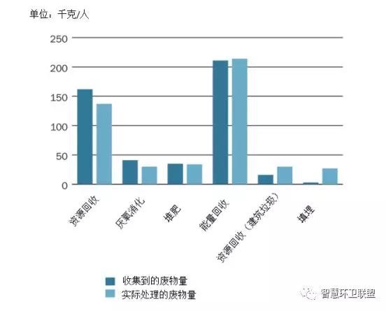 *圖表中以各種處置方法為目的進(jìn)行的收集量與各種方法的實(shí)際處置量間存在一定的差別。對資源回收利用和厭氧消化來說,收集量和處置量存在差別的原因是,一部分廢物在達(dá)到處理階段后被發(fā)現(xiàn)不符合處理的要求,通常都會在焚燒廠接受能量回收處理,因此也是能量回收的處理量稍稍高于以此為目的的收集量的原因。建筑垃圾資源回收的實(shí)際處理量要高于收集量,原因是焚燒廠產(chǎn)生的金屬和底灰會在分類后,得到循環(huán)利用。近年來,實(shí)際接受填埋處理的廢物量要原告于以填埋為目的而進(jìn)行收集的量,主要原因之一是焚燒廠能量回收會產(chǎn)生大量飛灰,只能接受填埋處置。