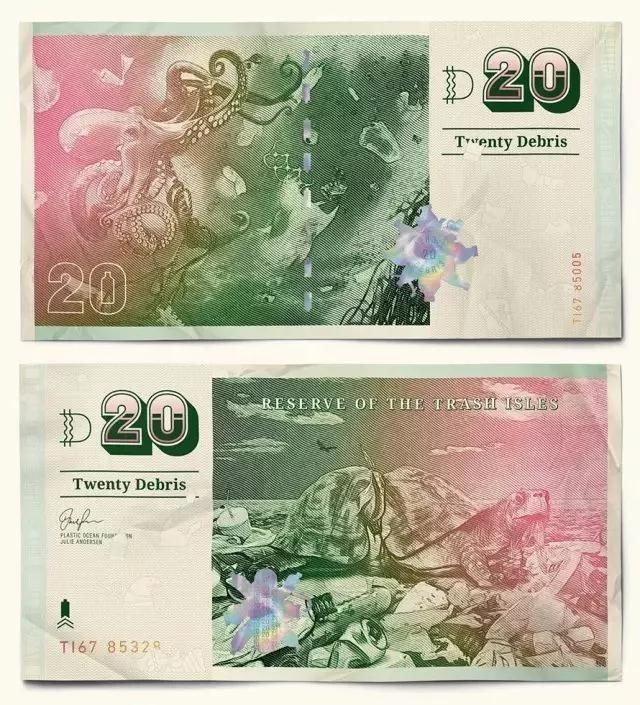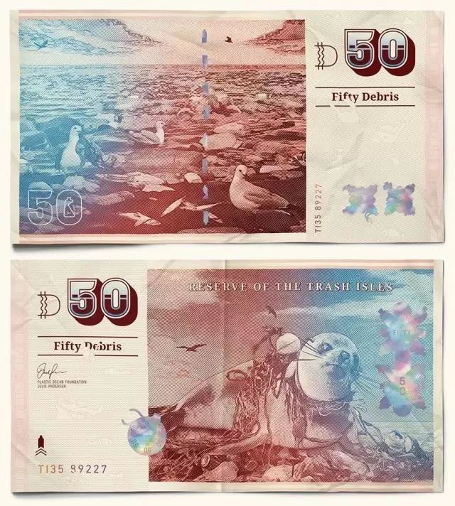 其他國家的貨幣都是領導人或風景名勝,垃圾群島共和國的貨幣則獨樹一幟,均是動物遭受海洋垃圾迫害的慘烈場景。