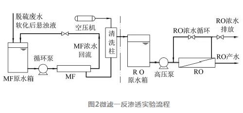 微濾技術(shù)高效的固液分離性能、較大的膜通量和良好穩(wěn)定性,近年來受到了越來越多的關(guān)注。將微濾與反滲透相結(jié)合而形成的雙膜污水深度處理工藝在垃圾滲濾液、造紙廢水以及再生水工程中的應(yīng)用也十分成功。然而,對于水質(zhì)復(fù)雜的脫硫廢水,采用雙膜組合工藝處理時,其系統(tǒng)運行穩(wěn)定性以及出水水質(zhì)有待進一步研究。