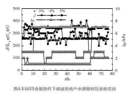 由圖4可知,不同SS含量條件下的產(chǎn)水通量均出現(xiàn)不同程度的波動;壓差在大部分時間內(nèi)保持穩(wěn)定,部分出現(xiàn)降低的點。分析原因是實驗過程中溫度變化造成的,當(dāng)溫度升高時,產(chǎn)水通量增大,壓差會有所降低。