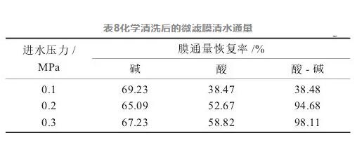 水中的顆粒、有機物以及膠體等物質(zhì)會在微濾膜表面發(fā)生架橋、吸附進而導(dǎo)致膜污堵,因此需要定期對膜進行清洗。周衛(wèi)青、李進等針對微濾膜的清洗進行了相關(guān)研究,確定酸堿聯(lián)合清洗效果最佳。據(jù)此,采用堿洗、酸洗、酸-堿聯(lián)合清洗3個清洗方案,通過恒定進水壓力條件下膜的產(chǎn)水通量的變化來表征膜過濾性能的變化。清洗實驗結(jié)果見表8;