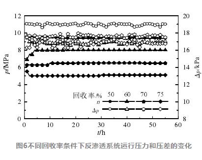 由圖6可知,系統(tǒng)運行壓力、壓差均隨著回收率的增大而增大,并且在各個回收率條件下運行時,壓力、壓差基本穩(wěn)定。當(dāng)回收率為75%時,設(shè)備運行壓力超過了膜元件本身最高操作壓力( 8.3 MPa),影響膜的使用壽命。