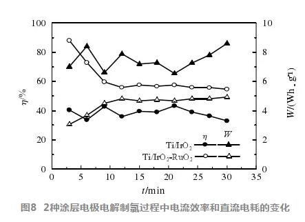 由圖8可知,Ti/IrO2涂層電極的電流效率和直流電耗分別為40%、7.9 kW.h/kg,Ti/IrO2-RuO2涂層 電極的分別為60%、4.5 kW.h/kg。Ti/IrO2涂層電極的電流效率明顯低于Ti/IrO2-RuO2涂層電極,直流電耗大大高于Ti/IrO2-RuO2涂層電極。原因是Ti/ IrO2涂層電極析氯反應(yīng)進行得較差,隨著電解液中Cl-含量下降導(dǎo)致傳質(zhì)效率下降,電流效率開始逐步 下降,直流電耗逐漸升高。電解過程中電解液溫度略 有升高也是一個原因。