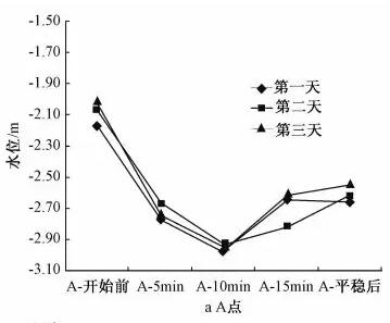 汛后試驗(yàn)時(shí),由于各點(diǎn)測(cè)水位和取樣的工作量太大,且受制于現(xiàn)場(chǎng)交通條件,因此在觀測(cè)點(diǎn)加裝了水位探頭,實(shí)時(shí)讀取數(shù)據(jù)。取樣則調(diào)整到調(diào)蓄池,在調(diào)蓄池蓄滿后,取池內(nèi)水樣送檢,然后實(shí)施放空作業(yè),每日重復(fù),直至試驗(yàn)結(jié)束。