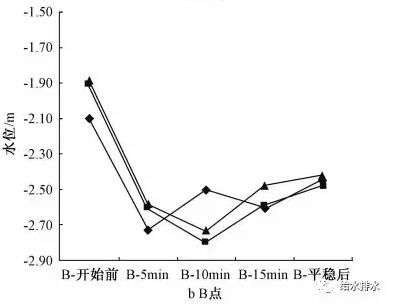 試驗(yàn)發(fā)現(xiàn),A、B、C、D2、E1等5個(gè)點(diǎn)的水位,會(huì)隨F調(diào)蓄池進(jìn)水至蓄滿而呈U型狀變化,以A、B、C為例(見(jiàn)圖2),基本都在10~15 min時(shí)水位變化最為明顯。但位于遠(yuǎn)端的D、E、D1等3個(gè)點(diǎn)幾乎未發(fā)生變化。由此可以初步判斷,F(xiàn)調(diào)蓄池對(duì)進(jìn)水總管的拉動(dòng),至C點(diǎn)結(jié)束,總長(zhǎng)約1 200 m;調(diào)蓄池的運(yùn)行,僅對(duì)鄰近的管網(wǎng)起到了收水效果。
