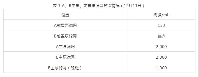 故障三:凝結(jié)水中有樹脂,過熱蒸汽電導(dǎo)率超標,給水泵主泵、前置泵濾網(wǎng)壓差大,檢查有樹脂。12月11日5:00檢修處理給水泵密封水進水濾網(wǎng)時發(fā)現(xiàn)網(wǎng)面內(nèi)有樹脂,樹脂顆粒完整,顆粒偏小。同時,化學儀表取到水樣后發(fā)現(xiàn)過熱蒸汽電導(dǎo)率高達1.4 μS/cm(剛升爐時,人工分析蒸汽二氧化硅合格),并在7:30最大至1.8 μS/cm。檢查發(fā)現(xiàn)給水泵主泵、前置泵濾網(wǎng)壓差大,A、B主泵、前置泵濾網(wǎng)樹脂情況見表 1。