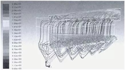 利用CAE技術(shù)對設(shè)備內(nèi)部進行CFD流場模擬分析(見圖5),以此結(jié)合新型均風結(jié)構(gòu)(已獲國家實用新型專利)來改善內(nèi)部氣流分布,進一步降低設(shè)備結(jié)構(gòu)阻力。