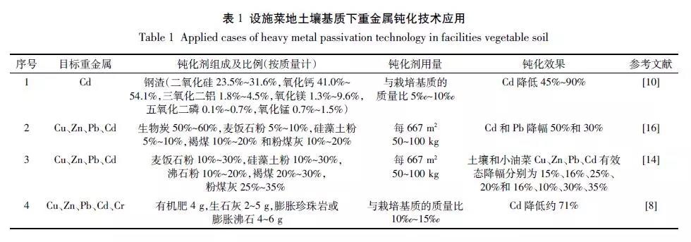設(shè)施菜地土壤基質(zhì)重金屬的鈍化技術(shù)的研究方法以田間試驗(yàn)為主,少量采用實(shí)驗(yàn)室內(nèi)試驗(yàn)的方法。涉及的主要污染物有Pb、Cd、Cr、Cu、Zn 5種。用到的鈍化劑主要有(1)黏土礦物,如麥飯石粉、硅藻土粉等;(2)碳材料,如秸稈炭等;(3)硅鈣材料,如生石灰、珍珠巖等;(4)有機(jī)物料,如褐煤等;(5)工業(yè)廢棄物,如粉煤灰、鋼渣。每667 m2土壤中重金屬鈍化劑的用量為50~100 kg。鈍化劑組分中,按質(zhì)量百分比計(jì),生物炭50%~60%、麥飯石粉5%~30%、硅藻土粉5%~30%、褐煤10%~30%、粉煤灰10%~35%、有機(jī)肥40%、生石灰20%等。對比不同元素的鈍化效果,土壤中重金屬有效性平均降幅為Cd(29%)>Zn(24%)>Pb(23%)>Cu(22%),差異性不顯著。然而,蔬菜中重金屬有效性平均降幅為Cd(53%)>Pb(31%)>Cu(12%)>Zn(11%)。麥飯石、硅藻土、沸石土等非金屬礦物均具有較強(qiáng)的吸附、離子交換等特性,此類礦物及其改性產(chǎn)物與生態(tài)環(huán)境具有良好的協(xié)調(diào)性,已廣泛應(yīng)用于無機(jī)和有機(jī)污染的處理。試驗(yàn)證明,重金屬鈍化劑對土壤和小油菜Cu、Zn、Pb、Cd 有效態(tài)降幅分別是15%、16%、25%、20%及16%、10%、30%、35%,可單獨(dú)施入設(shè)施菜田,也可與底肥混拌后施用。生物炭具有多孔性、較大的比表面積、較強(qiáng)的表面吸附能力、高度的化學(xué)惰性,對有機(jī)和無機(jī)污染物具有高度的親和力,可作為土壤中污染物的鈍化劑。生物炭配施麥飯石、硅藻土、褐煤、粉煤灰為主要原料的鈍化劑,Cd 和Pb降幅可以實(shí)現(xiàn)50%和30%。鋼渣作為大量存在的工業(yè)廢棄物,能夠顯著降低植株中的Cd 45%~90%,其效果優(yōu)于粉煤灰、赤泥和石灰(表 1)。