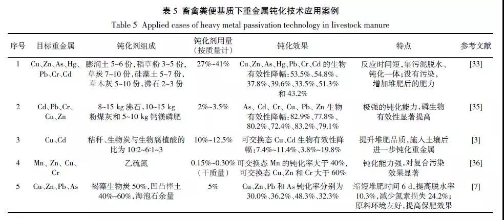 國內(nèi)外控制畜禽糞便中重金屬污染的主要方法是在堆肥化過程中加入鈍化劑,利用畜禽廢棄物有機(jī)物形態(tài)變化絡(luò)合固定重金屬,使其活性鈍化,生物有效性顯著降低。目前的專利技術(shù)主要針對于豬糞和雞糞,涉及的污染物為Hg、As、Pb、Cr、Cd、Cu 和Zn 等,平均鈍化率分別為19%、41%、58%、78%、28%、42%和62%。用到的鈍化劑主要有(1)黏土礦物,如海泡石、膨潤土、凹土等;(2)碳材料,如秸稈炭等;(3)含磷材料,如鈣鎂磷肥等;(4)硅鈣材料,如沸石等;(5)有機(jī)物料,如腐植酸、稻草粉等;(6)工業(yè)廢棄物,如粉煤灰等;(7)其他,如乙硫氮。鈍化劑的用量按質(zhì)量計(jì)為畜禽糞便基質(zhì)(濕質(zhì)量)的2%~41%(表 5)。