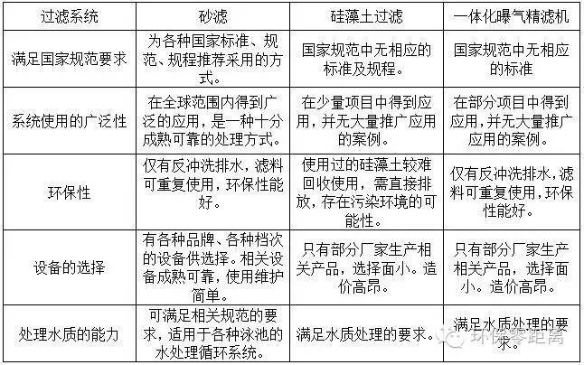 泳池過濾系統(tǒng)為循環(huán)處理系統(tǒng)的重要組成部分,該系統(tǒng)的選擇直接影響著游泳池水處理系統(tǒng)是否滿足使用要求?,F(xiàn)在的過濾系統(tǒng)有砂濾、硅藻土過濾、一體化曝氣精濾機(jī)等,他們各有特點(diǎn),具體的分析見下表。