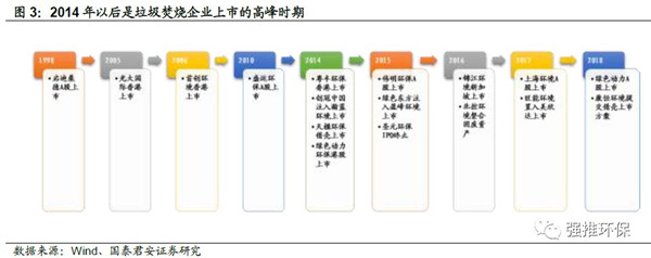 2014年及以后是我國垃圾焚燒企業(yè)上市的高峰時期。自1985年第一座垃圾焚燒廠在深圳建成,“十一五”期間垃圾焚燒行業(yè)開始發(fā)展,目前大部分項目是在2012年以后開始投運。有了穩(wěn)定的運營業(yè)績,垃圾焚燒的龍頭開始上市,除了光大國際、首創(chuàng)、北控、桑德等綜合型環(huán)保集團,2017年垃圾焚燒產能前22名的公司有10家是在2014年后上市或準備上市。